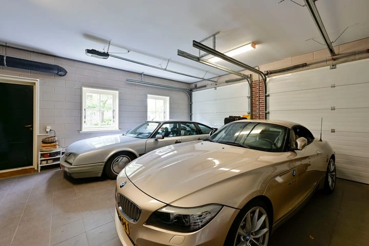 - Luxe garage met dubbele openslaande deuren, vloerverwarming, warmte-terug-wininstallatie en ruimte voor twee auto’s;