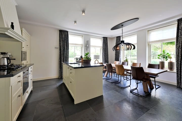 - Woonkeuken met natuurstenen vloer en vloerverwarming, spoeleiland, granieten aanrechtblad, eikenhouten kasten en luxe apparatuur;